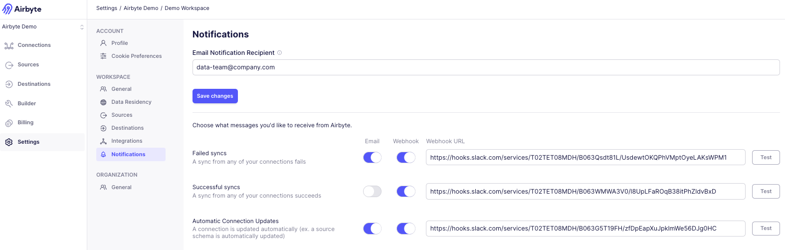 - Click Save changes to ensure you continue to receive alerts about your Airbyte syncs.